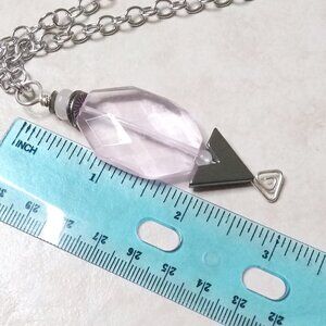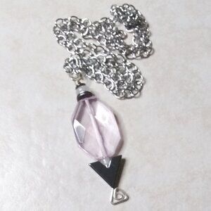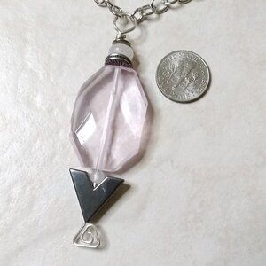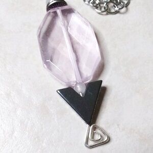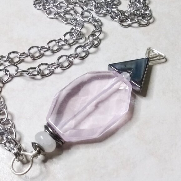 The smaller pink beads are genuine Rose Quartz; the dark gray chevron/arrow bead is Hematite and there are also some gunmetal black [dark gray] spacer beads embedded into this design. All beads are stacked on a hand shaped headpin with a geometric triangle design. The hardwired chain is stainless steel and measures right at 24" - it is freely adjustable, simply hook the lobster claw clasp into any of the links to best fit the way you want it to...