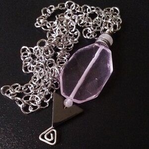 Focal Piece of this large pendant necklace is a large, pale pink, mostly clear, faceted bead. I am in all honesty not sure whether it's glass or pink quartz - I've got several of them in a pendant bead shipment and some look like they could be quartz, others look more like glass. As I'm not certain what it is, I will price this as if it is glass [it might well be!].