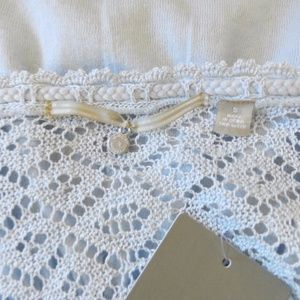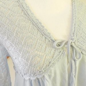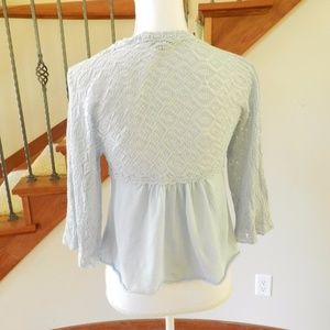 Pale blue cardigan by Knitted & Knotted for Anthropologie. Fine crochet top, bell sleeves, swing front. Size small.