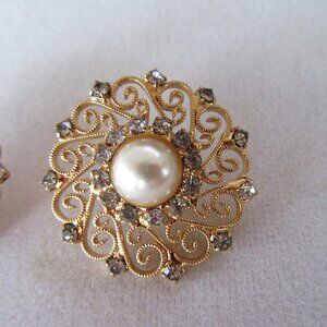 Elegant earrings measure 1 inch and are unworn. Perfect condition. Faux pearl is unscratched and all clear rhinestones are intact. Gold tone filigree metal is textured. Really nice. Also lightweight.