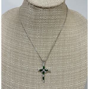 Delicate green & white crystal cross pendant necklace - silvertone setting and fine 18" long adjustable chain. This set is NEW in box and would make a lovely gift. My photos don't do justice to the lovely sparkle and shine of this piece. No flaws - No hallmarks.