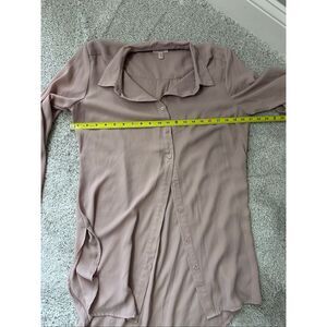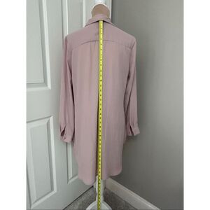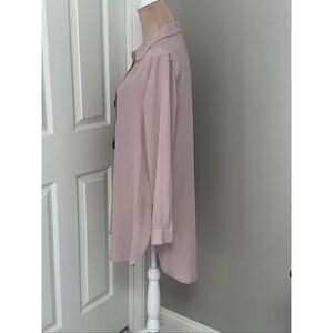 Beautiful delicate dusty pink Como Vintage chiffon blouse in size M. Button front, deep shirttail hem, button cuffs, cute center pleat back. Longer length. Great tailored blouse that can be dressed up or down. Great career piece for office wear which can transition into night activities. EUC! See pics for measurements.