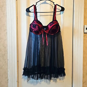 Delicates Sheer Lace Black Red Babydoll Top XL
