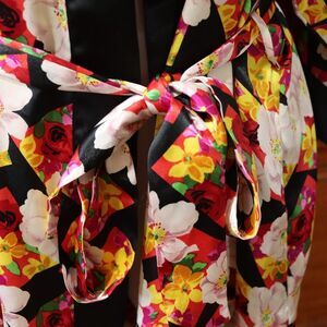 Delicates presents a stunning 90s vintage kimono robe featuring a vibrant floral pattern in red, yellow, and white against a black background. This statement piece brings effortless elegance to any wardrobe, perfect for layering over casual outfits or wearing as a chic loungewear wrap. The belted waist and inner tie provide a customizable fit, while the flowing silhouette adds graceful movement. Ideal for lovers of vintage fashion, statement prints, or unique layering pieces, this kimono combines colorful design, lightweight comfort, and timeless 90s style into one versatile garment.