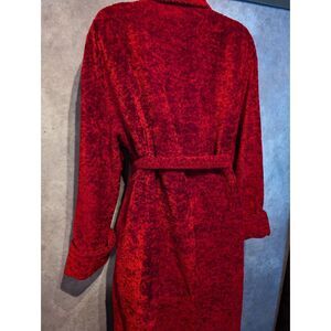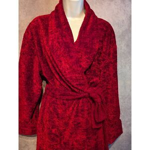 Delicates, Terry cloth robe that feels like heavy and luxurious, crushed velvet, thick and heavy weight, warm, deep red bathrobe. Vintage. In excellent condition. Size medium but it is liberal in sizing and could fit up to an xl. Beautiful and warm!