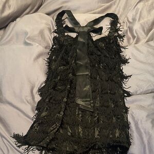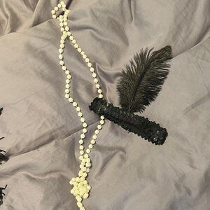 Chic black flapper dress with headpiece and necklace. Perfect for themed parties. Small part of side seam is open but easily stitched up