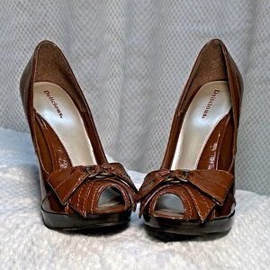 Brown Delicious heels w/ bow on toe. Unworn, new condition with slight cosmetic imperfection on left heel (see photo).