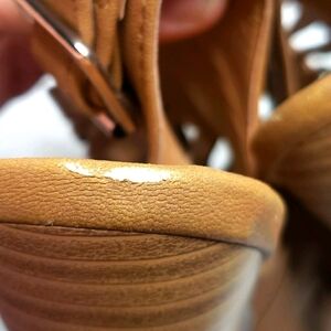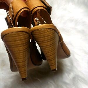 These heels by Deliciois SO chic! They are a chestnut leather that goes with so many outfits! They have a peep toe in the front with a golden belted strap in the back. The heel is 4”.