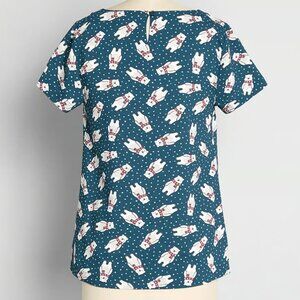 We couldn't think of a more perfect pair to your pleasant personality than this silky crepe blouse from our ModCloth namesake label! Featuring an exclusive, holiday print atop a navy blue background with red-and-white stripe scarf-wearing polar bears and white speckled dots scattered all over, you will be donning festive, winter style. The short sleeves and back keyhole of this lightweight top instantly put a jolly smile on your face.