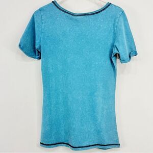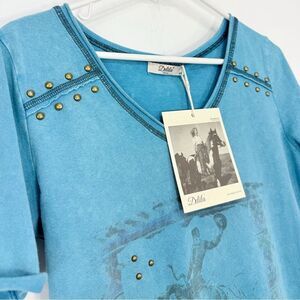 Delila Texas Teal Blue Rodeo Cowboy Graphic V Neck Studded Short Sleeve Shirt NEW