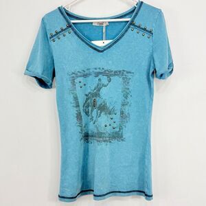 Delila Texas Teal Rodeo Cowboy Graphic V Neck Studded Short Sleeve Shirt NEW