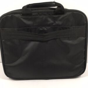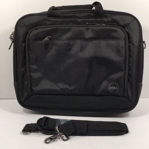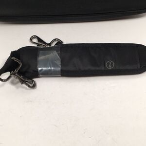 Dell black laptop bag, includes strap which has never been used. Tons of compartments and organization in this bag. Includes travel strap at back of bag to slip onto luggage. There’s a flaw on one top handle, see photo above for pic.