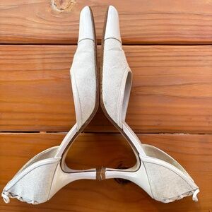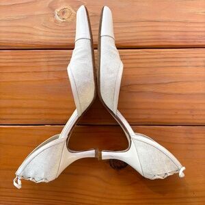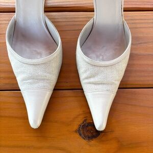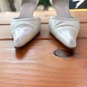 These are beautiful preowned Y2K Delman cream/off white colored pointy toe heels. They are leather and a material that looks like linen. 2.75 inch heal, laced up bow accent in the back. There is some wear inside the shoe, on the sole and the toes. Some light spots on the leather and material but are not noticeable while wearing. They would be an excellent shoe to get a little light touch up at a shoe repair. They are a 7.5 M. They will be too tight if you have a wide foot. These could fit a size 7 since they fit on the tighter side of 7.5.