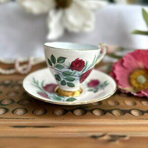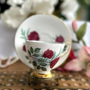 Delphine Bone China Tea Cup & Saucer Set With Red Rose Design Made In England