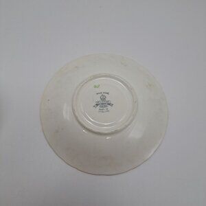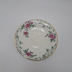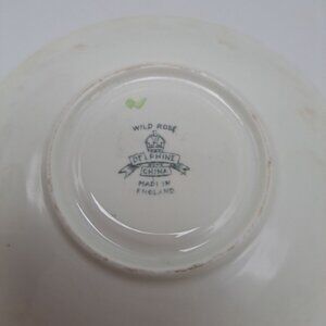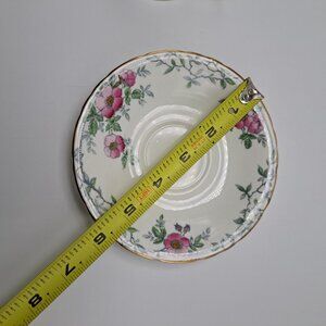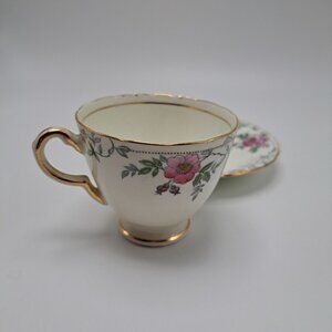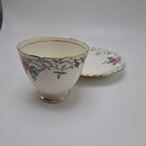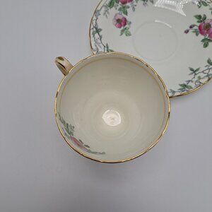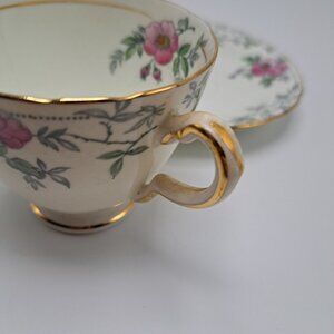 This teacup and saucer set were made by Delphine between 1930 and 1941. The pattern is Wild Rose. It features pink wild roses in gray branches on a soft cream background. Both pieces have gold trim. The set appears to be hand colored. There are no chips or cracks. The teacup has extremely fine crazing as seen in the pictures as well as a stain inside.