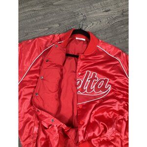 Embrace a sporty style with this Delta Box bomber jacket. Its vibrant red hue and satin texture make it a standout piece. The XXL size provides a comfortable, relaxed fit, ideal for layering in colder weather. Decorative piping and lettering add a classic touch to this versatile wardrobe staple.