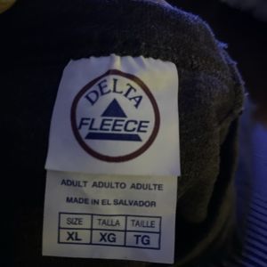 Delta Fleece Sweatshirt Black Cat Hawaii Popoki Floral Long Sleeve Crew Neck XL Get cozy in this Delta fleece sweatshirt with a graphic print of a black cat lurking around a tropical floral garden. This medium weight pullover features a crew neck and long sleeves. The cotton blend material is machine washable for easy care.