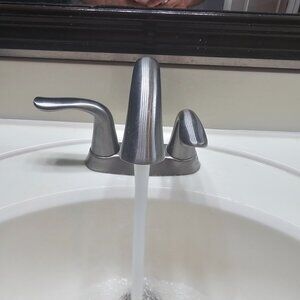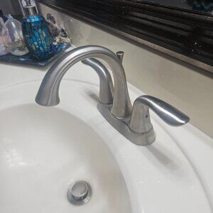 For sale: a Delta 2538-SSMPU-DST-R Centerset Bathroom Faucet in a Stainless finish. We're remodeling our bathroom and switching to matte black fixtures (we replaced it with a Moen Avri). This faucet is in good used condition and has been thoroughly cleaned with a vinegar soak. It's a perfect upgrade from a generic or off-brand faucet. Bundled with this item is a brand-new metal Kraus pop-up drain assembly with overflow.