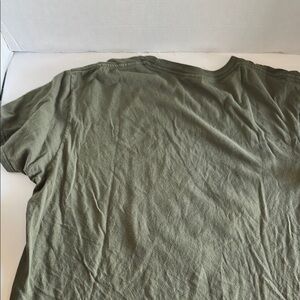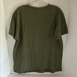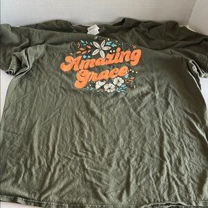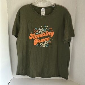 Olive green tee with colorful floral design. Soft and comfortable fabric.