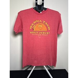 Great condition, funny Jesus T-Shirt featuring a Taco with the phrase, “Wanna Taco bout Jesus? Lettuce Pray” and the verse Mark 16:15.