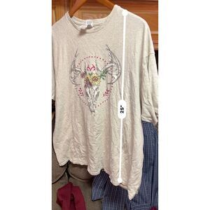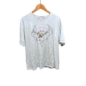This Delta Pro Weight t-shirt features a unique deer skull and sunflower design. The light gray color and relaxed fit make it a comfortable and stylish choice. Women's size 2X.