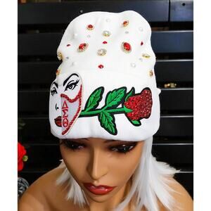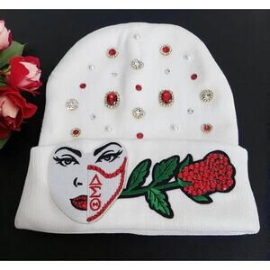 Show off your sorority pride with this beautiful Delta Sigma Theta beanie! This white beanie features a striking red design, complete with a delicate rose accent, sparkling rhinestones, and elegant pearls.
