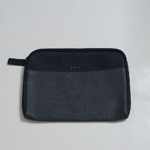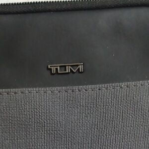 Elegant Tumi toiletry bag in black and gray. Ideal for travel essentials. Durable and stylish design.
