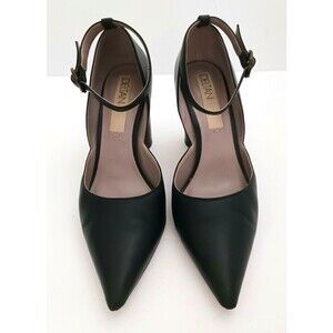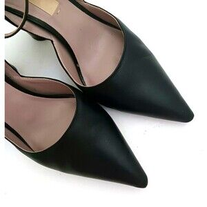 The Deltan Black Leather Point Toe Pump is a stylish and sleek shoe with an ankle strap and a tortoise cylinder 3.5" block heel, perfect for adding a sophisticated touch to any outfit. The pointed toe and buckle closure give it a chic and modern look, while the high heel height provides comfort and support for all-day wear. Made from premium soft lamb leather, this pump is designed with both fashion and quality in mind, making it a versatile and timeless addition to any woman's shoe collection. US 8.5M. Pre owned, clean inside and out, leather looks great, heels are not marked. The underside of the tip of the point toe has a little wear at the tip, they have been conditioned and polished.