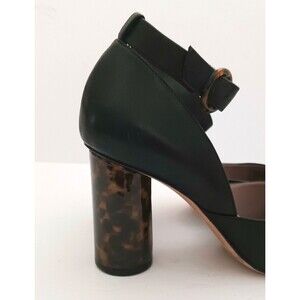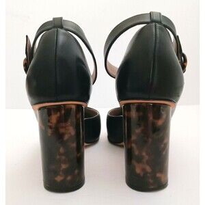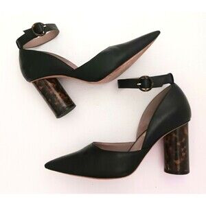 Deltan Blk Leather Point Toe Pump Ankle Strap Tortoise Cylinder Block Heel 8.5M