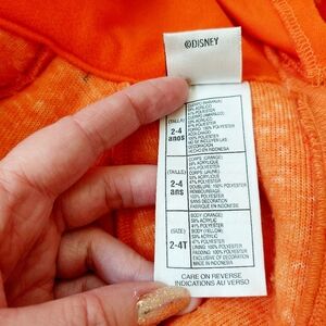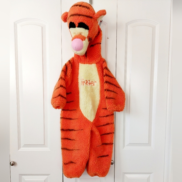 Really lovely one piece tigger costume. Incredible quality Tigger face on the hood and very warm costume. Back zip. Embroidered "Tigger" across the chest. Produced in the early 2000s for The Disney Store. Size 2T-4T.