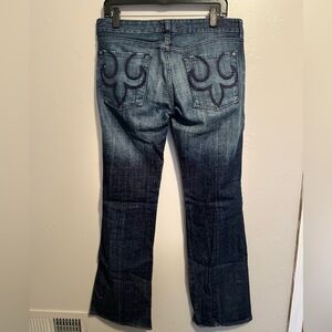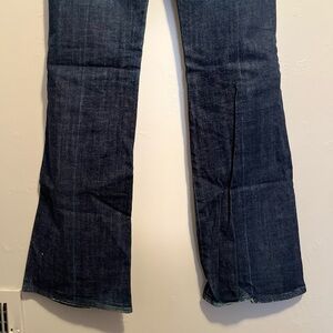 These jeans feature a stylish flare and wide leg design, perfect for a contemporary look. The rich blue wash with a subtle gradient effect adds a touch of sophistication. Made from durable denim, they ensure both comfort and longevity.