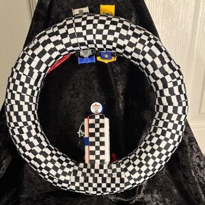 Experience thrilling races with this deluxe car set featuring vibrant red, yellow, and blue vehicles made into a wreathe. Perfect for young car enthusiasts.