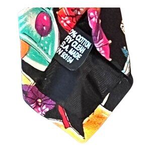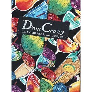 This "Dem Crazy" tie features a colorful Cocktails and Drinks pattern, giving it a playful and tropical theme. Made of 100% cotton, this designer tie has a vintage style and measures one size with a short length. The tie is crafted in the United States and has a width of 3.75 inches, making it suitable for men looking to add a fun and unique accessory to their outfit.
