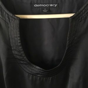 Democracy ruffled collar three-quarter sleeve dress with a fantastically unique plunging semi-circle collar. Has a 3 inch zipper under left armpit. 62/38% rayon/cotton shell creates a beautiful satin look. Lined. Measured flat on table, 35 inches long from top of shoulder and 17 inches armpit to armpit. 1st & last 2 are stock photos.
