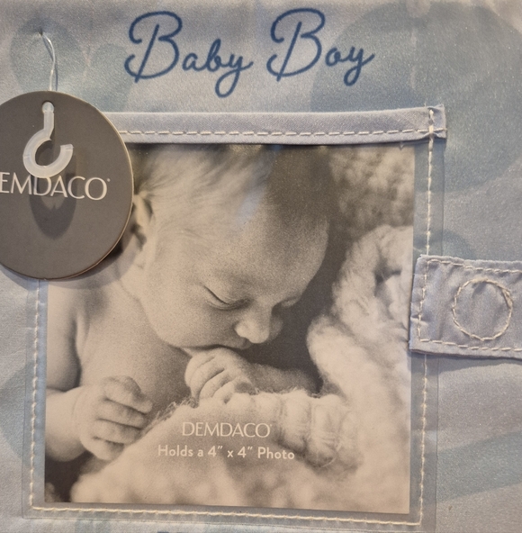 NWT Demdaco baby photo frame in soft blue. Holds a 4" x 4" photo. Perfect for nursery decor or baby shower gift.