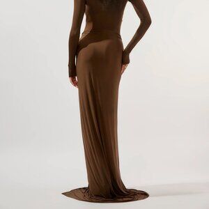 Deme by Gabriella June Gown in Chocolate Brown long sleeve maxi draped mermaid