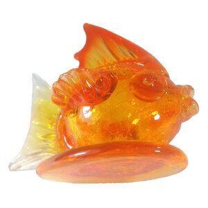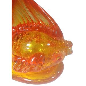 This stunning vintage handblown Demekin lantern blown figurine features a hollow, crackle glass construction with a gorgeous multicolor orange and yellow orange coloration. The design depicts a koi goldfish, giving off a 3D effect. Measuring 6.25" in length, 5.5" in height, and 5" in width, this decorative piece showcases a tropical sea life theme and was likely produced in Japan during the mid-20th century. It has also been attributed to Blenko.