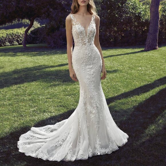 Fitted bridal gown with v-neckline and beaded lace bodice with sheer accents and low back. Perfect for the glam girl.