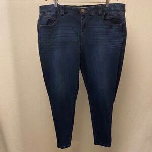 Democracy Size 20W AB Technology Skinny Ankle Jeans, Mid Rise, Stretch, Dark Wash. Preowned. Gently worn. Waist measures approx 42”. Inseam measures approx 26.25”. Rise measures approx 11”. Slimming panels, ab technology, and ankle skimming details accentuates these jeans. Fit: this style fits true to size.
