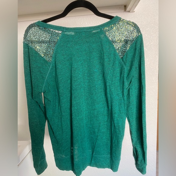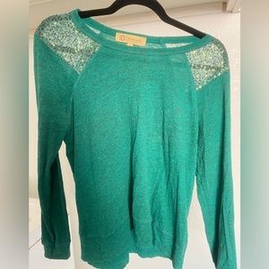 Democracy size medium. Green with goldfish green sequence. Great used condition, no flaws. Pit to Pit 18 inches. Length 23 inches.