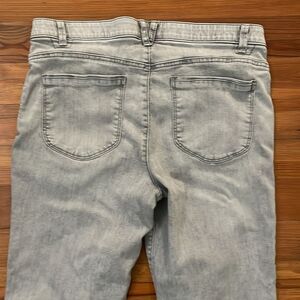 Ab Solution, light grey, 67% cotton, 19% polyester, 4% other, 1% spandex, denim, ankle, cropped jeans with a frayed hem by Democracy in a women's size 16. Button fly. 5-Pocket design. Machine washable. Approximate measurements shown in photos. In good pre-owned condition with some signs of wear from normal use.