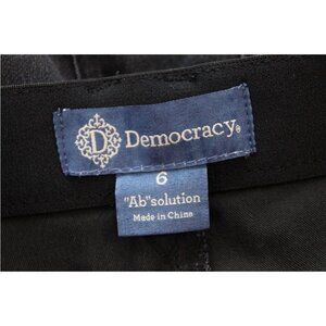 The Democracy Ab Solution Jeans in size 6 are a sleek option for women looking for a slimming and comfortable fit. Made from a blend of polyester, spandex, rayon, and cotton, these black stretch denim jeans feature a solid pattern, zip and button closure, and a mid-rise waist. With a slim fit and ankle length, these jeans are perfect for all seasons and have a touch of preppy style. The breathable fabric ensures comfort, while the pockets add functionality to the classic design. Upgrade your wardrobe with these versatile and flattering jeans from Democracy.