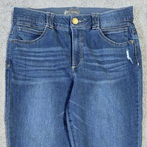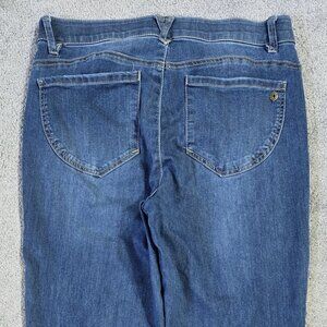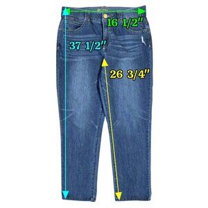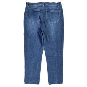 Good used condition, with no stains or tears. Straight leg ankle jeans, with an elastic waistband and tummy control panel. Comfortable and stretchy. Has whiskering, intentional fading, and slight distressing. Has 6 pockets and a zip fly/button closure.