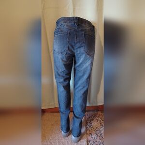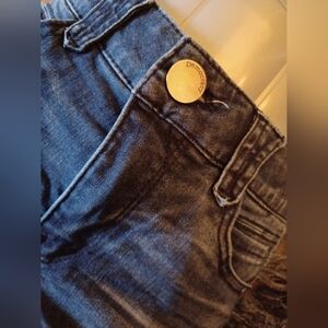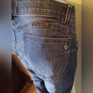 waist and belly control top support. distressed ripped detailing. blue denim jeans. D charm stud on back pocket. skinny pants. stretch. see pictures. they are part of the description. exclusive of ornamentation.
