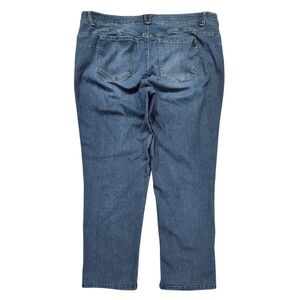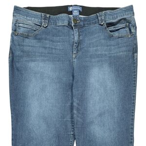 Good used condition, with no stains or tears. Comfortable and stretchy straight leg jeans. Has "ab" solution tummy control technology and an elastic waistband. Has 6 pockets and a zip fly/button closure.