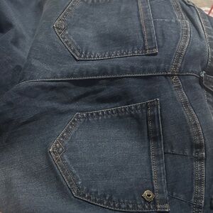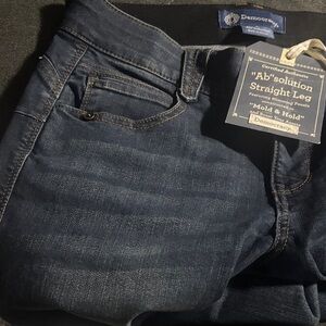 Blue jeans with slimming panels. Features 'Mold & Hold' design.