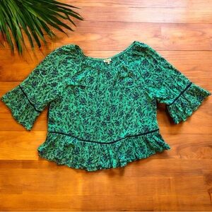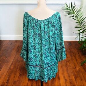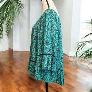 Flowy and feminine, this Democracy boho-style blouse features a green and navy floral print with delicate lace trim accents. The off-the-shoulder neckline, ruffle hem, and bell sleeves add a romantic, effortless touch to any outfit.