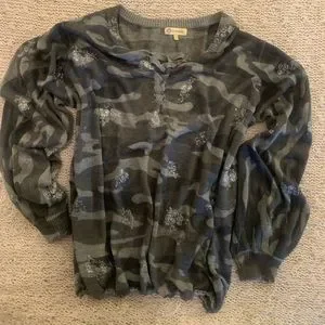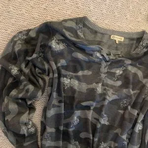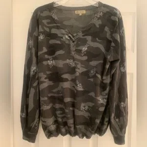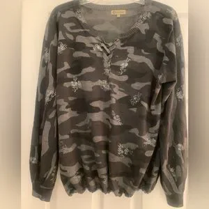 Super soft and light sweater with sparkly silver symbols, cuffed wrists, lace up front, elasticized waist, purchased in Warrick NJ at a cute boutique, worn once for few hours, is so much cuter on, looks brand new..