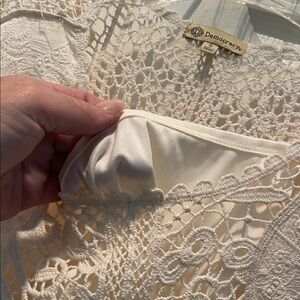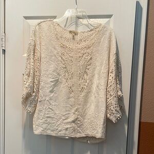 Chic lace blouse with intricate patterns. Perfect for casual or dressy occasions. Pair with jeans or a skirt.
