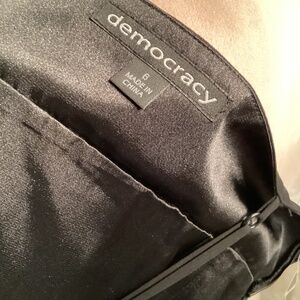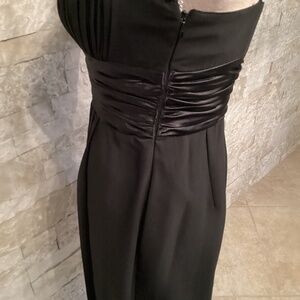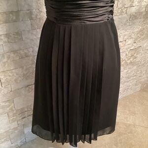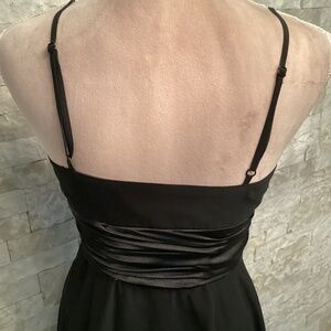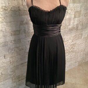 This pretty dress is a Democracy black spaghetti strap dress featuring a ruched or pleated bodice, a satin waistband, a side zipper and a flowing, pleated skirt. This type of elegant, shorter black dress is commonly referred to as a little black dress (LBD) or a cocktail dress, suitable for various semi-formal or formal events such as parties, weddings, or homecomings. This dress is new with tags.
